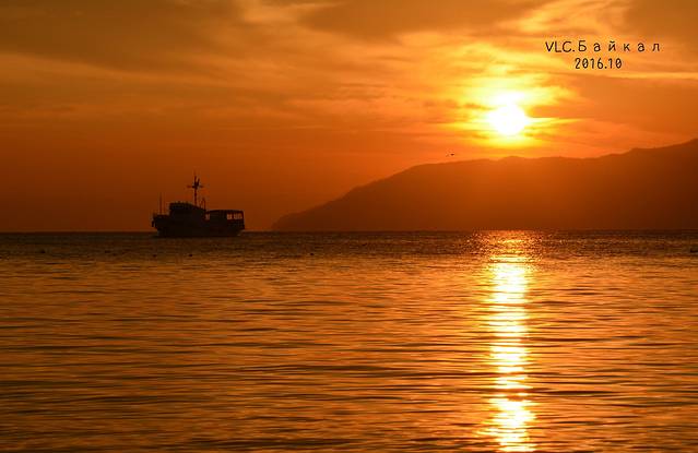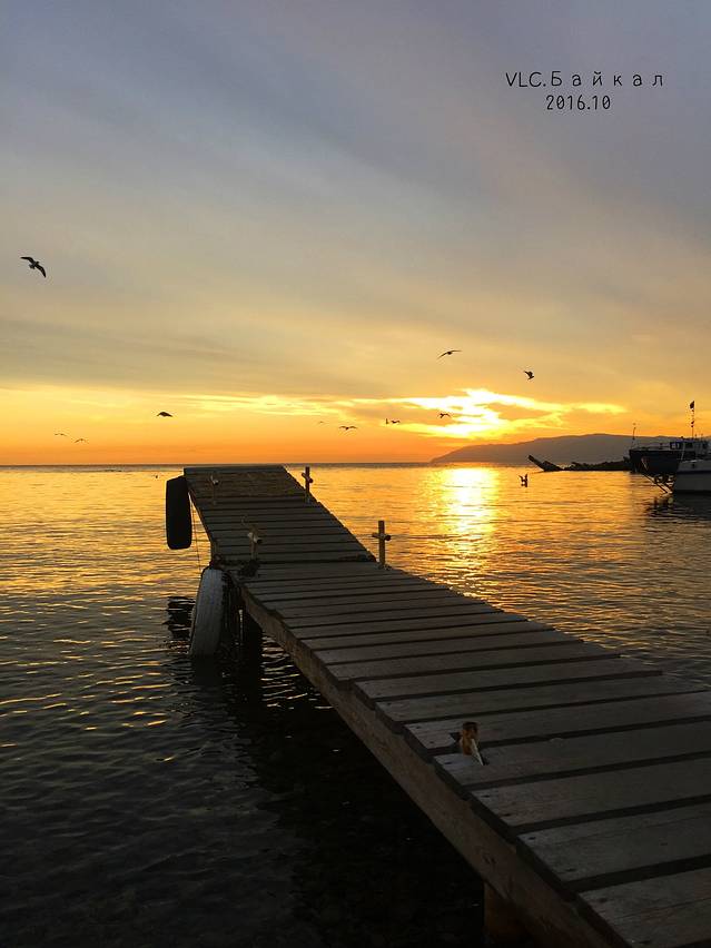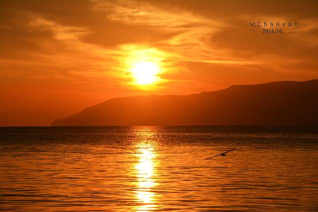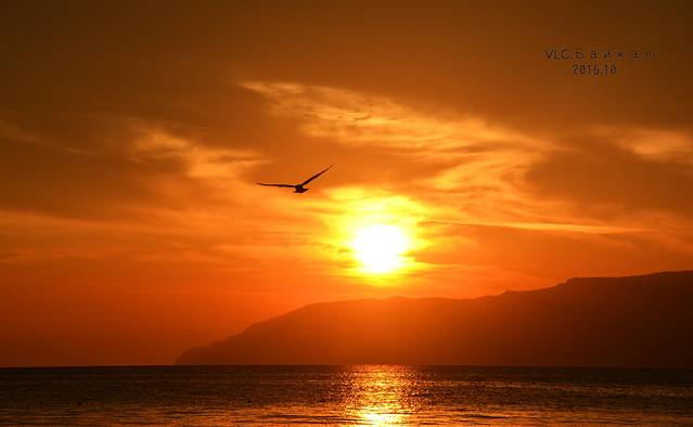橘色的天空,柔和的夕阳,盘旋的飞鸟,夕阳下的贝加尔湖美若仙境。