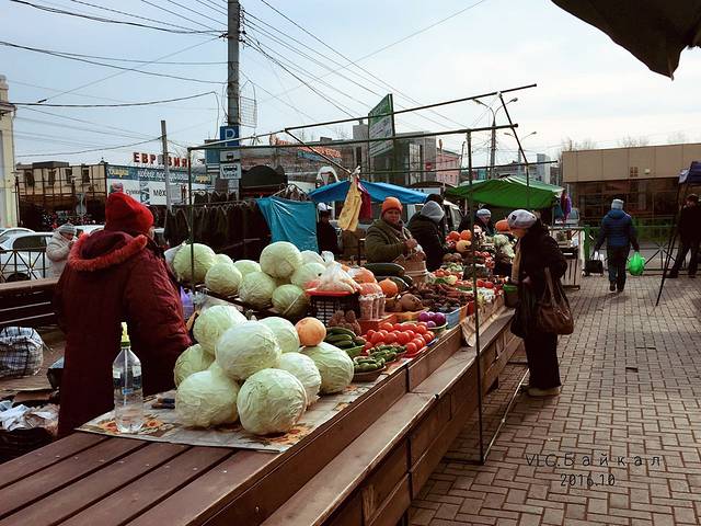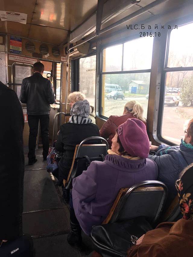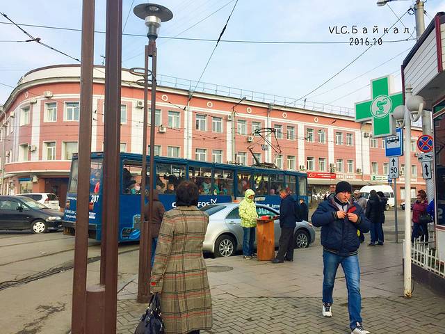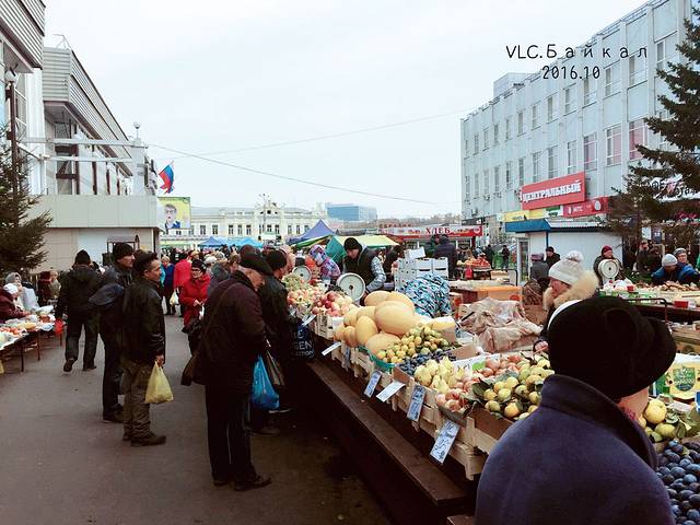 伊尔库茨克的公交车站十分难找,问路又语言不通,我们根据地图导航走到大概位置,并没有看到站牌,不过路边很多人在站着等待,八成就是车站了。通过翻译软件问了中央市场的方向,我们上了4路公交车。对于战斗民族的交通工具我是佩服的,从来到这个国度的第一天开始见到的车都是伤痕累累的,这辆公交车也很不例外,老式的苏联有轨电车,车窗依然都是裂痕。车票需要找售票员购买,四个人一共60卢布。上车后我们似乎被当作外星人一般,全车人都在看我们。本来战斗民族的人眼睛就巨大无比,被一车大眼球好奇打量的感觉无比诡异。
