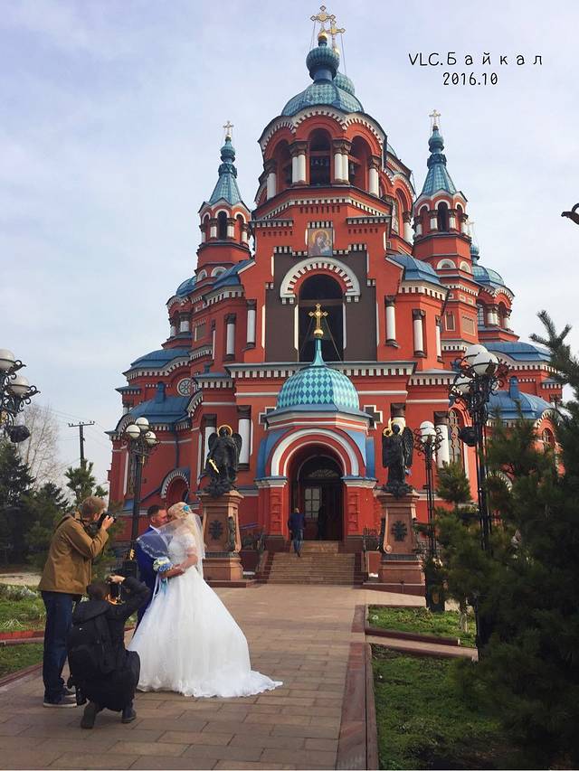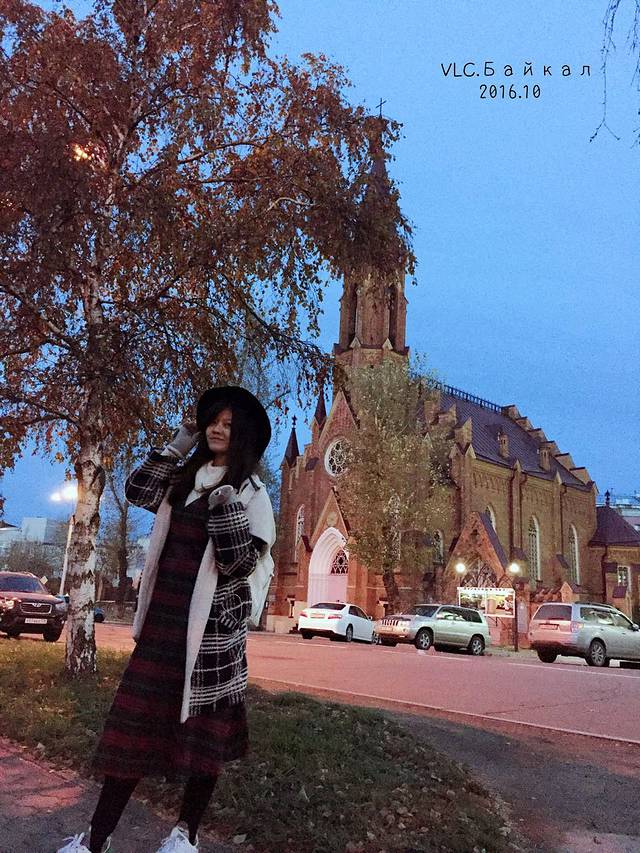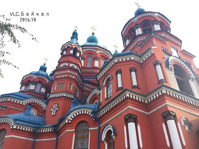 和世界保持联系的感觉真是太棒了!从Beeline出来,我们连上了2gis地图,配合街道上的地图指示,终于搞清楚了大概方向,市区教堂游正式开始。圣十字教堂就在不远处,位于列宁大街的东边,红白相见,四周围树木茂密,建筑的外延花纹十分精美,据说是当地布里亚特人的手工艺品常用的花纹。 走进去看了看,气氛很严肃,不断有人在进门祷告。我们不懂礼节,很快就退出来,拍了拍教堂的外延。