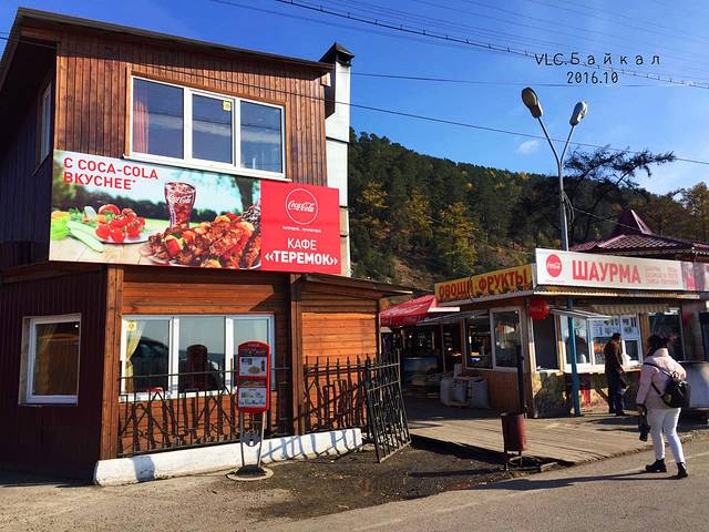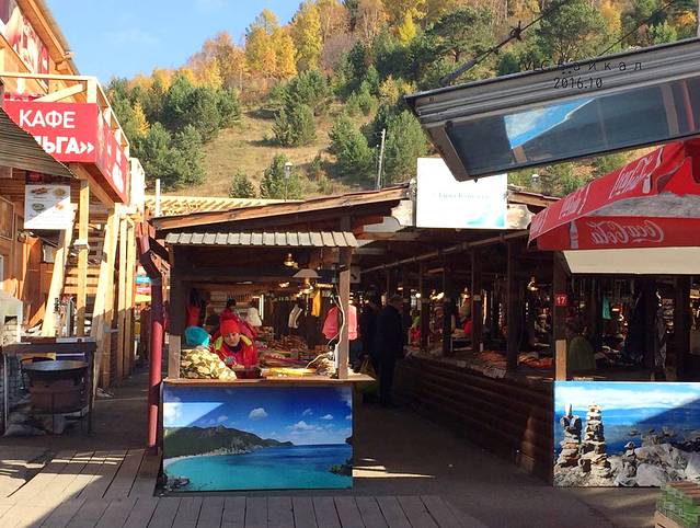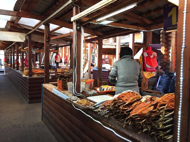 本来我们打算去坐船,到码头询问说要午后一点多才有一班,于是我们先去附近的鱼市场吃午饭。鱼市场距离海豹馆步行大约10min,市场中有吃有喝,还有卖纪念品的摊子。我们先在市场中买了腌制的奥姆鱼和蒸的熟鱼,找到市场门口的一间餐厅解决了午饭。奥姆鱼是贝加尔湖的特产,由于成长周期很长,味道异常鲜美。当地人一般将它制作成鱼干进行腌制,味道又咸又鲜,很特别,一条250卢布。不过奥姆鱼“留香”时间很长,碰过后哪里都会留下味道。