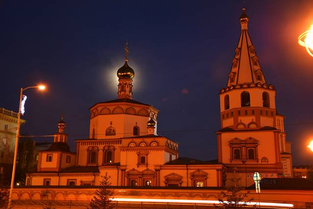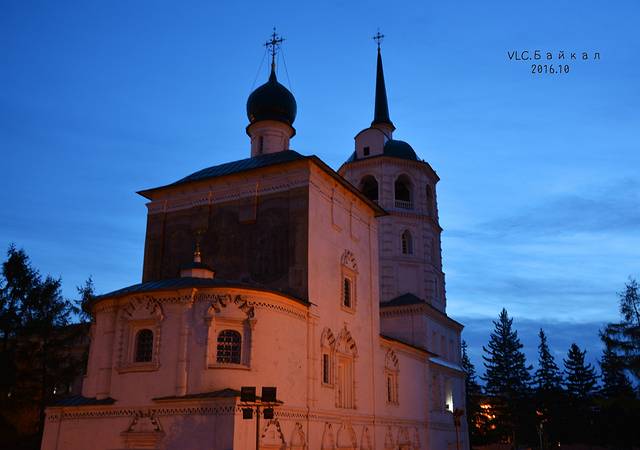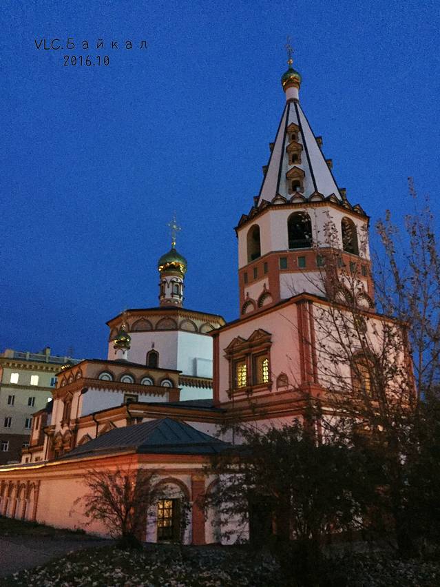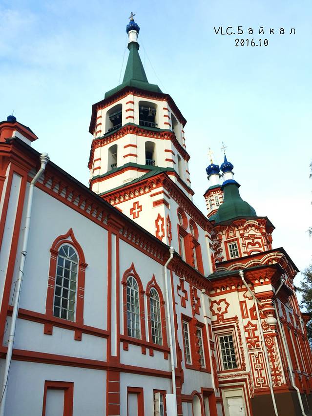 主显节大教堂就在开拓者纪念碑的对面,这座教堂始建于1693年,是伊尔库茨克第二古老的建筑,白色亮洁,各层由长方形、圆柱形、三角锥形组合在一起,仿佛是积木搭起的精美玩具,旁边还有两的金色的洋葱头形状的穹顶衬托着。