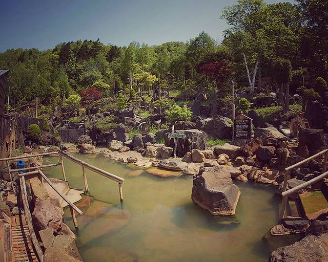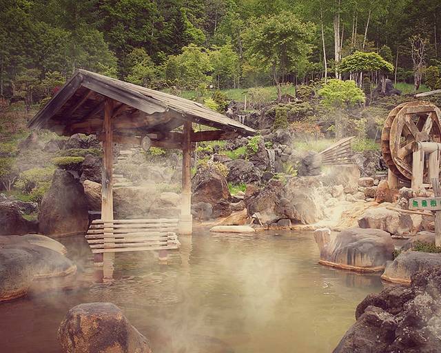 听郭桑讲定山溪已经有150年的历史,是一位叫作定山的修行者最早发现了川中涌出的温泉源头。经过百年来得创建,定山溪形成了现在具有一定规模的温泉地。原名“美泉常山”,后来才改名为定山溪温泉。而在定山溪温泉地区比较老牌的还属丰平峡温泉,这里的露天温泉格外有名,是专业的园艺家精心设计的。泉池的每一块石头都有讲究,与身体接触部分的石头是日高、十胜等地区滚圆的河石,不与皮肤接触的地方是用千吨重的羊蹄山脚的粗矿岩石组成的。石头较浅的地方可以整个人浸泡在温泉内,而石头较高的所在则可以躺平享受寝汤,是全世界独一无二的设计。