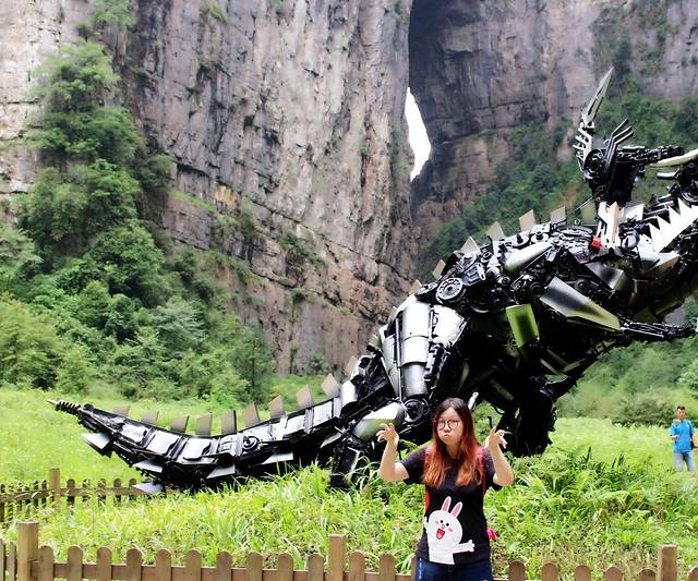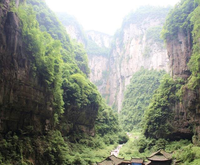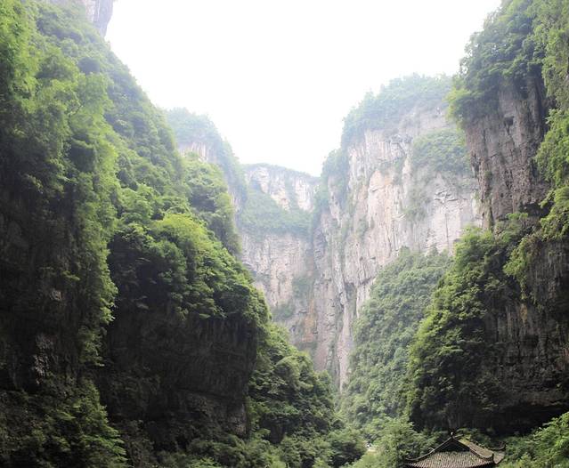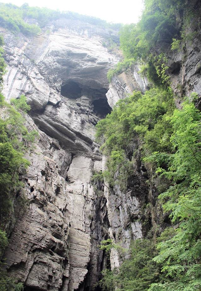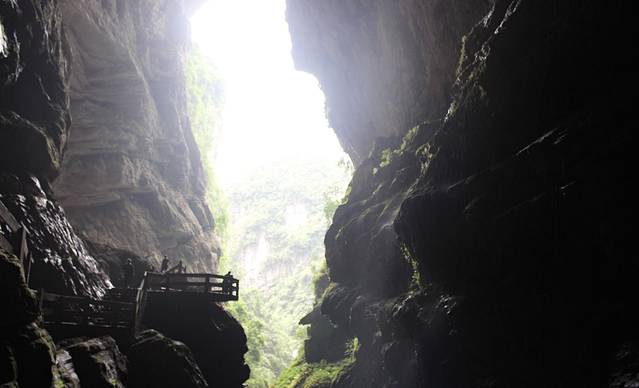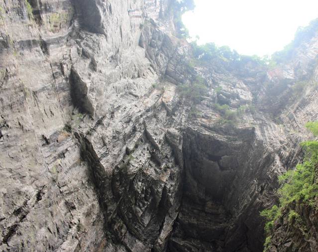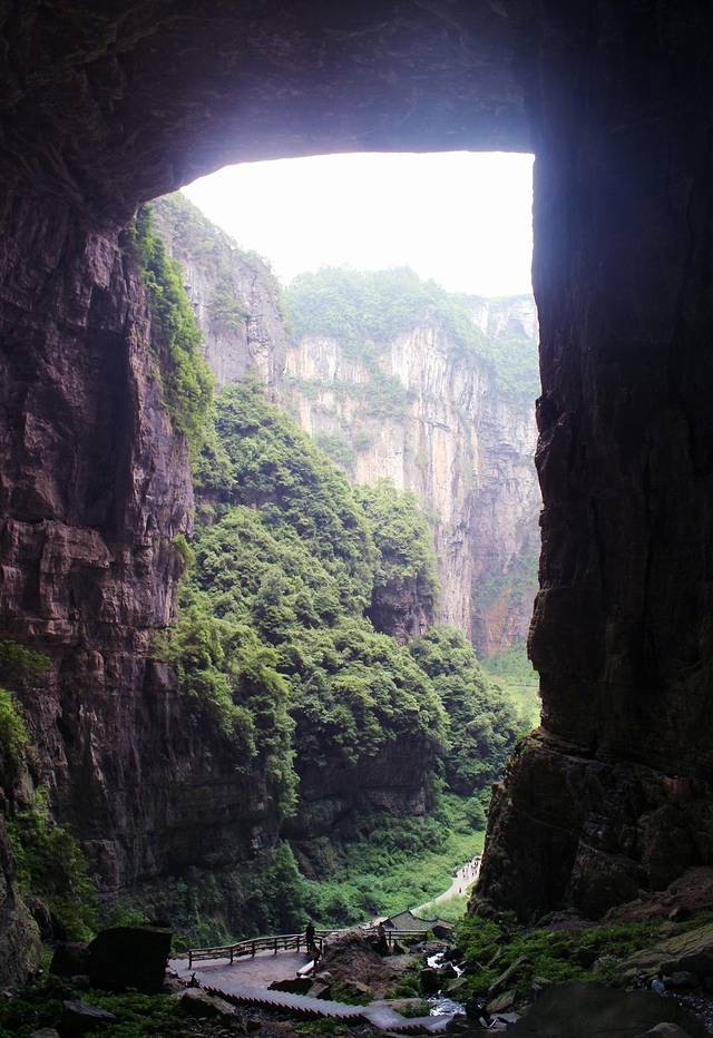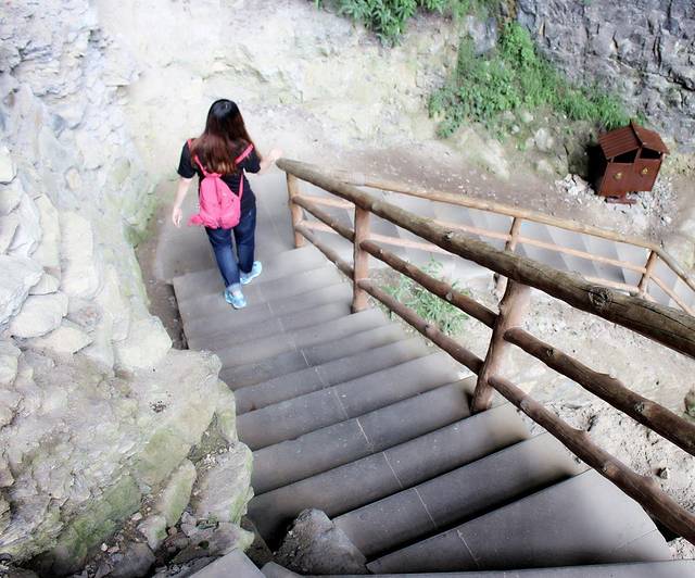 ——天坑的景点就是天生三桥,自然而形成的高耸的悬崖连接在一起。我们是从下往上看,先要坐电梯(我觉得满新奇)下到底下,然后再顺着路走就能经过三座桥啦。