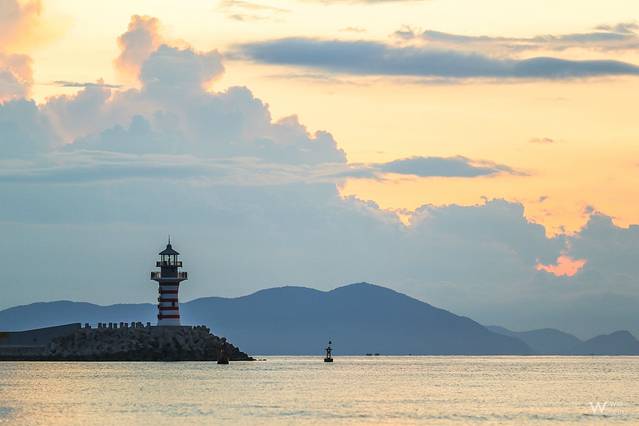 清水湾的海是比较平静的,沙滩也较为平缓。太阳躲在山和云的后方,也许在下一刻就会释放出璀璨的光芒。每次看到灯塔,都有一种说不清道不明的迷恋。