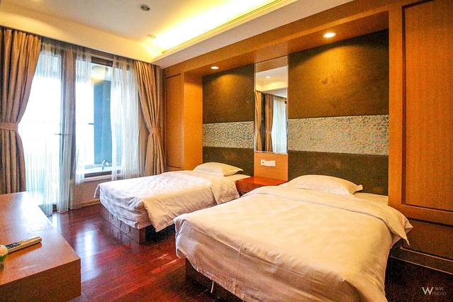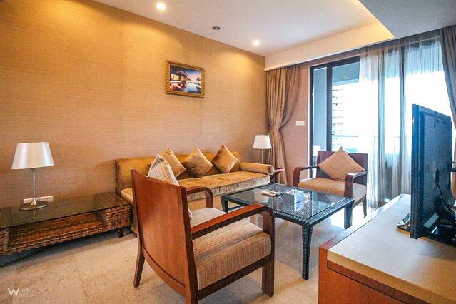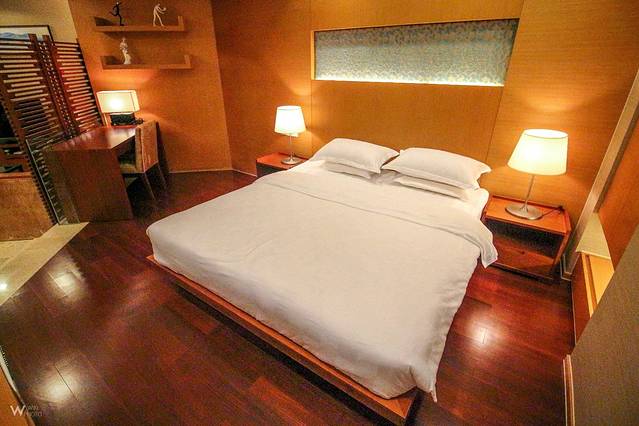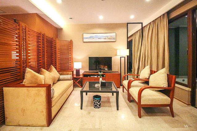 白天的时候忘记拍照了,晚上回到酒店才补拍几张。套房的客厅空间十分宽敞,家具的颜色款式也与室内暖黄的灯光相称,让人感到温馨。一道屏风将客厅与卧室相隔,倒是给房间增添了几分中国古典韵味。