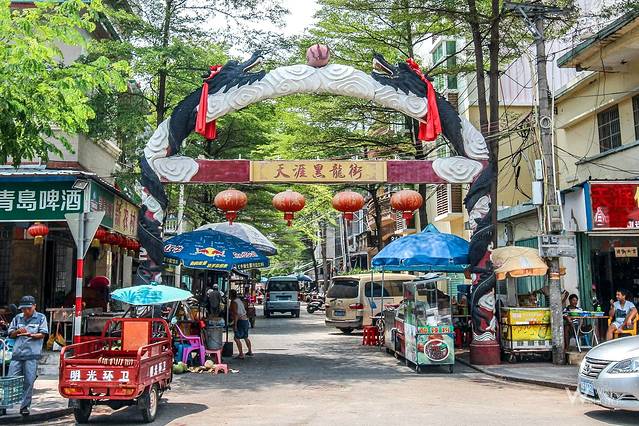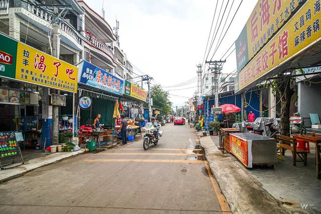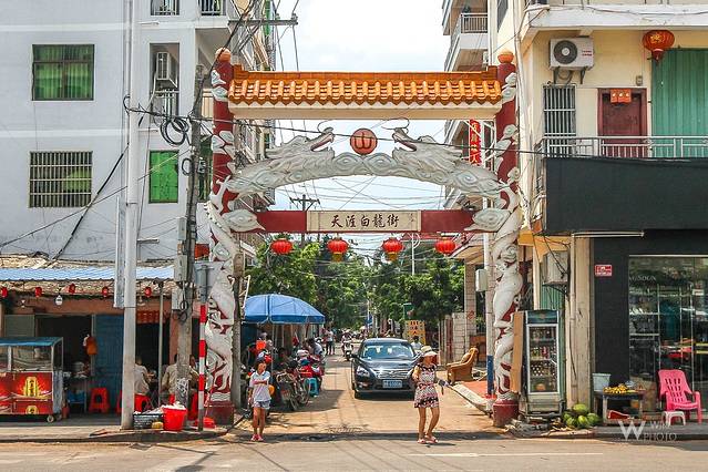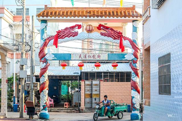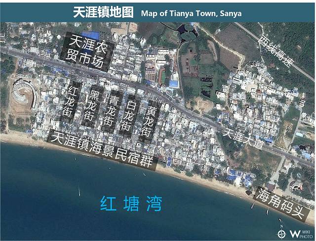 天涯镇的布局相对简单,一条天涯大道从中间穿过,右手边有天涯农贸市场,左手边是黄、白、青、黑、红五条龙街,街的尽头就是一排享有红塘湾一线海景的天涯镇民宿群。
