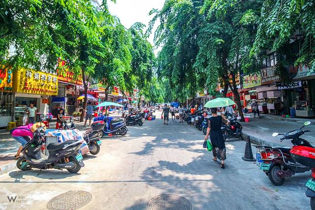 黄龙街一派宁静祥和的景象,阳光透过道路两旁的绿树斑驳地洒落在路面上。