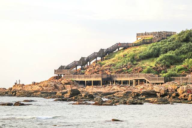 往南走有一片礁石,礁石上已经建好了木栈道和木栈台,走到这儿登上木栈台,就可以原路返回了。