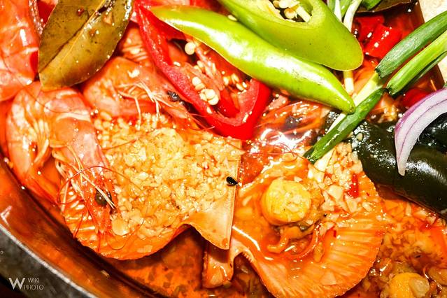 海鲜拼盘端上来的时候,两家人都惊呆了,口水直流啊。海鲜主料有基围虾、花蟹、扇贝、芒果螺和石斑鱼,配菜有青椒、红椒、洋葱、海带、大葱、冻豆腐等,卖相100分。至于味道,我感觉并不像看起来那么入味,而且这么吃还有一个“缺点”,就是味道相对单一,不像不同海鲜用椒盐、白灼、辣炒、蒜蓉等多种做法做出来那样味道丰富。