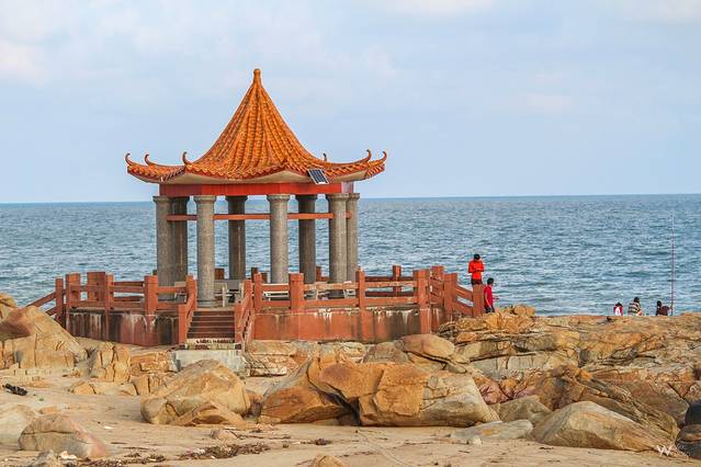 礁石上建有一座景观亭,比例有些失调,不知是工匠失误还是有意为之。