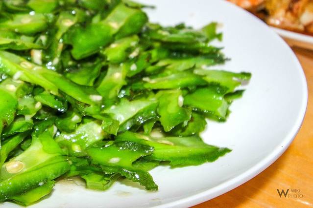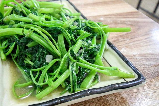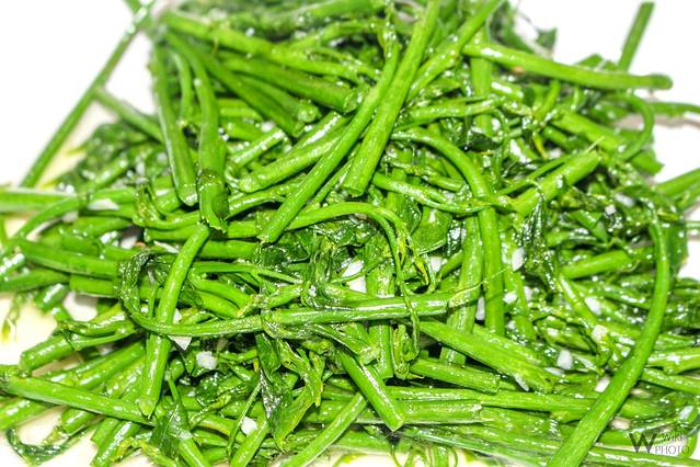 再来一盘蒜蓉炒空心菜。空心菜是南方农村普遍栽培的蔬菜,在北方却很少能吃到。