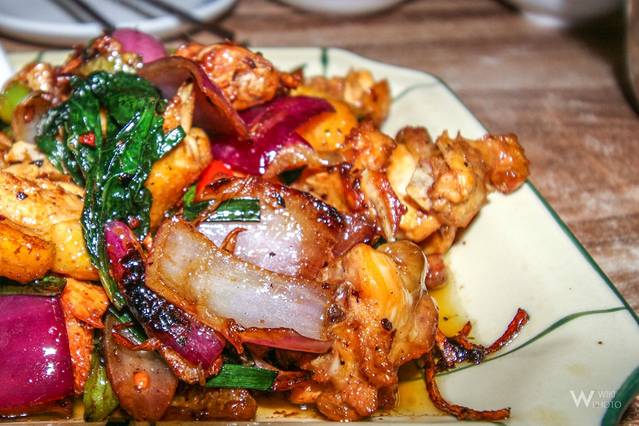 果木烤文昌鸡的“卖相”能打101分,多的这1分给它的造型,简直太搞笑了。每人一只手套,直接开撕,蘸特调的甜辣酱吃,味道也相当不错。放眼望去几乎每桌都有人点这种烤式的文昌鸡。