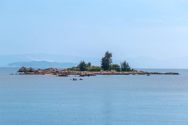 近处的一座无人小岛,也长了一些植被,不知是风将种子吹过去的,还是渔民将种子带过去的。远处朦胧的岛屿就是蜈支洲岛。