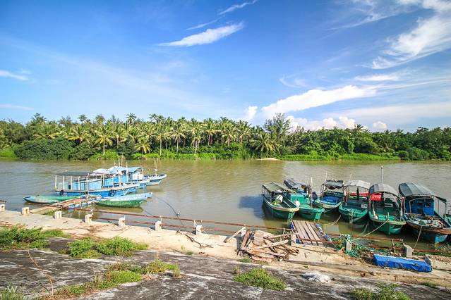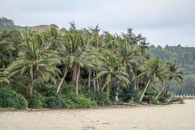 按照地图上椰子岛的位置,开到陵水河,沿着河边一直走到入海口就到了。正巧这时接到了一个陵水学妹的电话,看到我发朋友圈的照片,问我还在不在陵水,想晚上请我们吃饭。我说我们准备去“椰子岛”,她说那个“椰子岛”还没怎么开发,就是一个长满椰子树的小岛而已,值得一去的是椰子岛对面的“水口庙”,顺便约了晚上在分界洲岛对岸的海南味道餐厅吃晚餐。