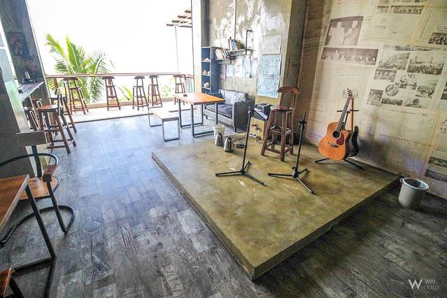 很容易就找到了我们住的天涯此时精品客栈,入门后是一片宽阔通透的大厅,吊顶很高。前台、餐厅、吧台、球桌连成一体,小舞台上虽然摆放了吉他、麦克风、音箱等设备,但听前台小哥说淡季客人较少,已经很久没有邀请驻唱歌手表演了。