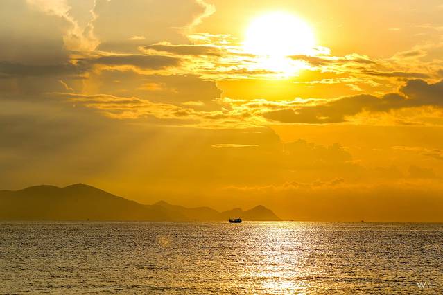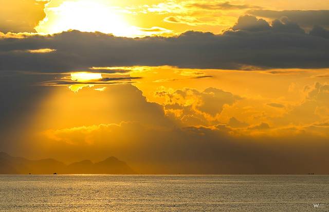 第三天清晨,我已经习惯了在天亮之前跑到阳台预测一下能否看到日出,若是天边的朝霞火红,就会瞬间清醒,准备好出去拍日出,若是乌云密布就倒头继续睡。今天看来运气不错,简单洗漱背上相机就下楼去海边了。