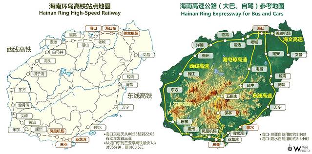 先说高铁,海南环岛铁路由海南东环铁路和海南西环铁路组成,连接海口至三亚,东环308公里,西环345公里。主要运行D字头列车,兼顾普速列车,东环线已开通10个车站,分别为海口站、海口东站、美兰机场站、文昌站、琼海站、博鳌站、万宁站、陵水站、亚龙湾站、三亚站;西环线已开通16个车站,分别为海口站、老城镇站、福山镇站、临高南站、银滩站、白马井站、海头站、棋子湾站、东方站、金月湾站、尖峰站、黄流站、乐东站、崖州站、凤凰机场站、三亚站。