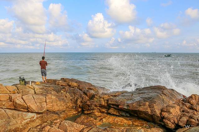 澎湃的海浪在不停拍打着礁石,附近的村名却悠然自在地钓着鱼。