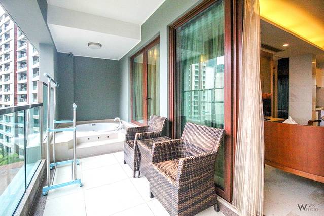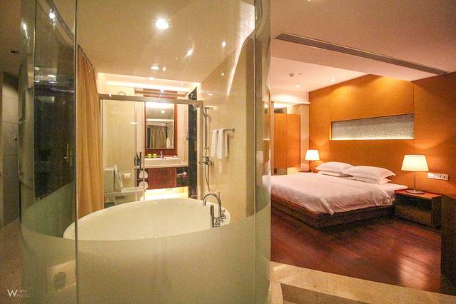 浴室的设计是整间海景套房的精妙之处,有浴池,也有淋浴喷头。若是拉上窗帘,可能啥都还看不出来。但如果把窗帘拉开,就有感觉了,澡盆的视野穿过客厅正对着阳台,若是白天可以看到大海。