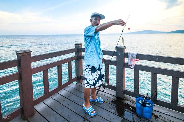 一位大爷倚着木栈道海钓,正巧有鱼儿上钩了,自豪地向我们展示他的收获。