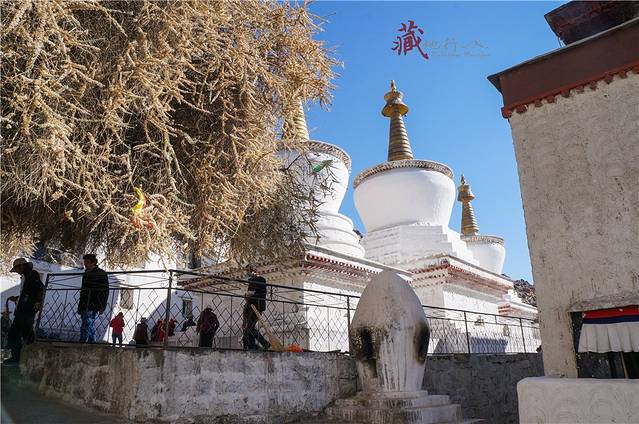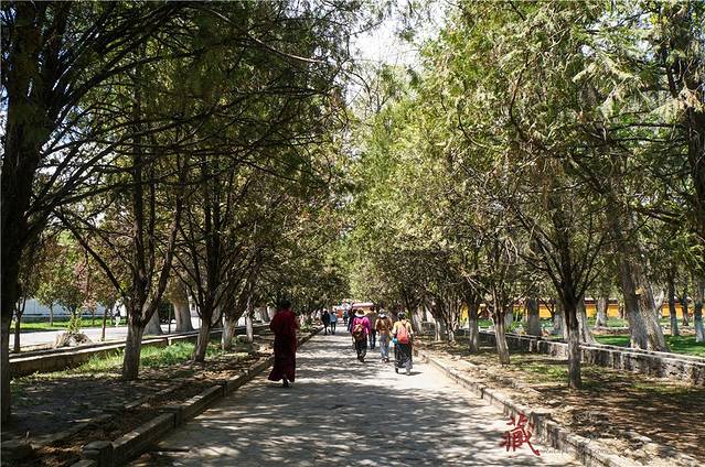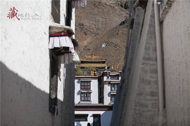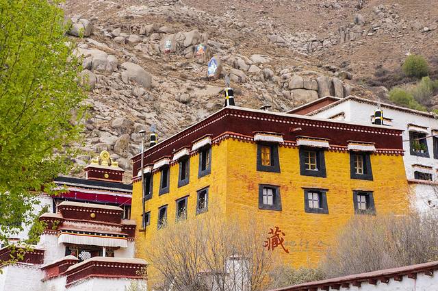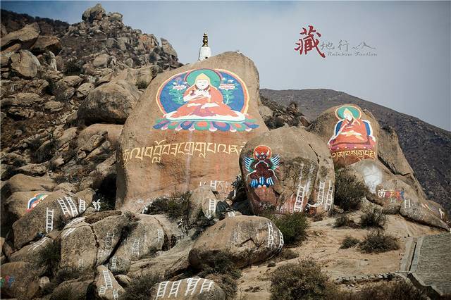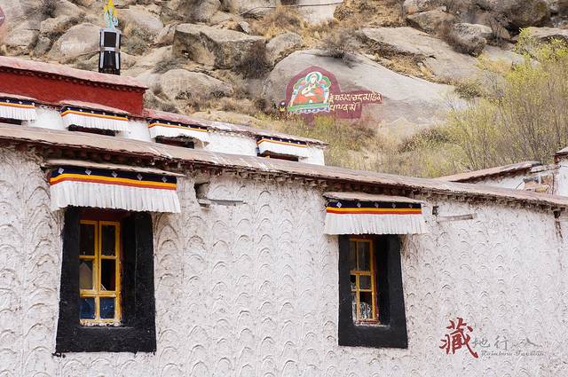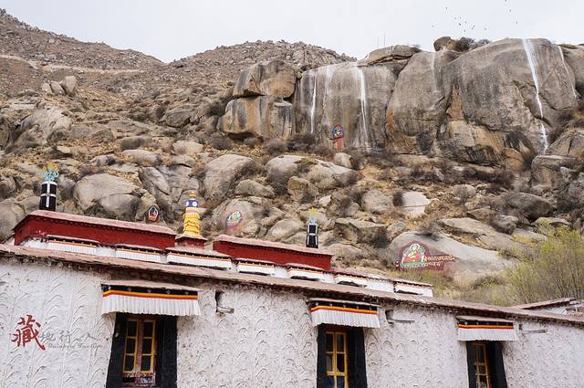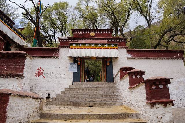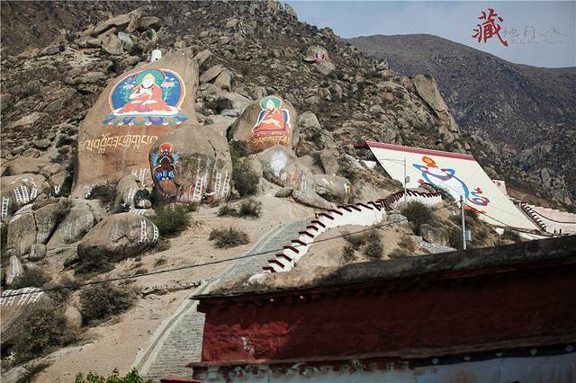从哲蚌寺沿西侧的台阶拾级而上,进一个大门后的左侧是一条小路,旁边有流水,经常会有一些藏族妇女在溪边洗铃铛。走上一个山间的小平台,可以俯瞰山谷的景色。继续往上走,左边远处有绘在山石上的佛像,后面的铁架子就是雪顿节时的晒佛台。每年雪顿节哲蚌寺都会举行晒佛仪式,在山坡上展示一幅巨型佛像唐卡,引来大批信徒和游客前来祷福,场面壮观。著名的甘丹颇章就在右边一处有很高台阶的地方。