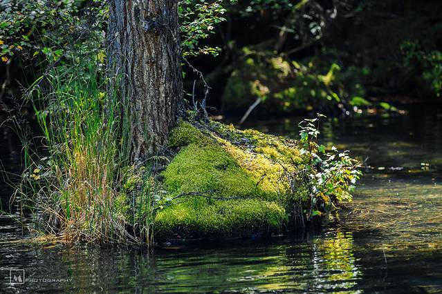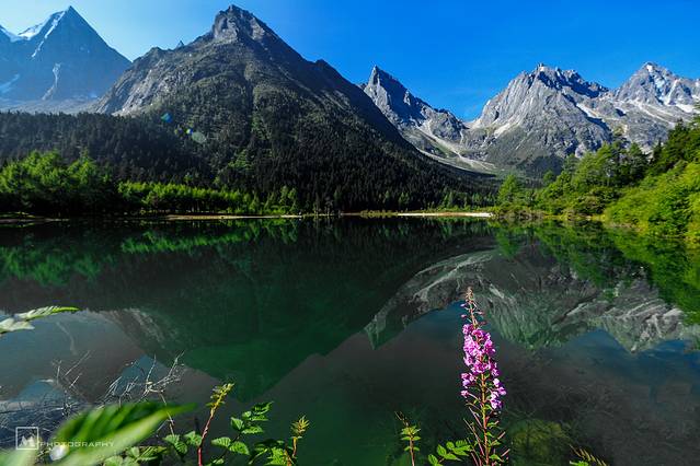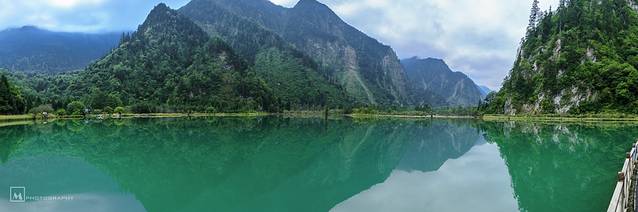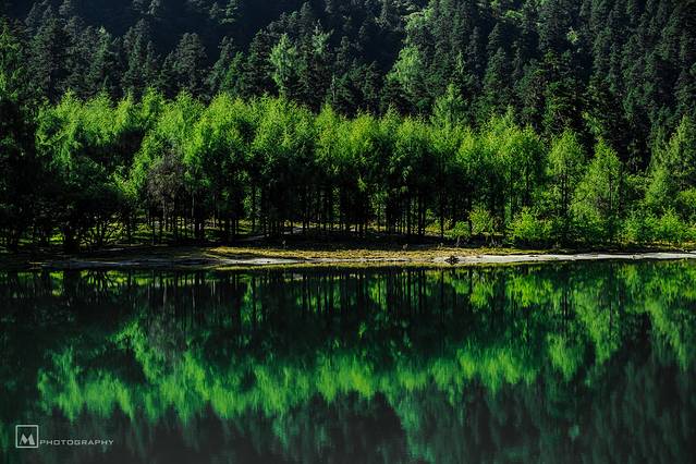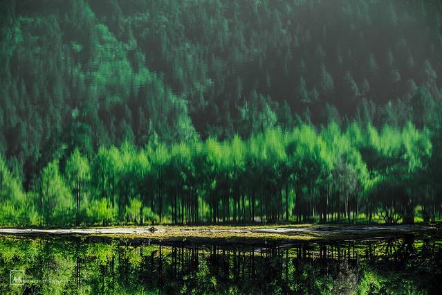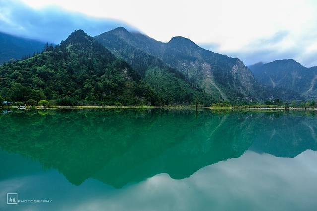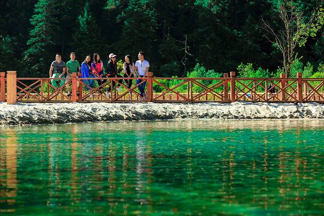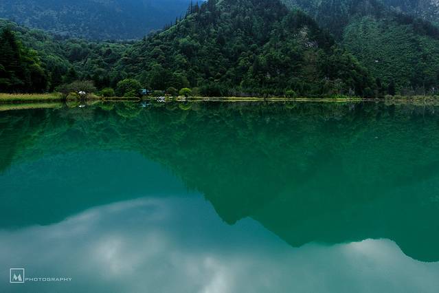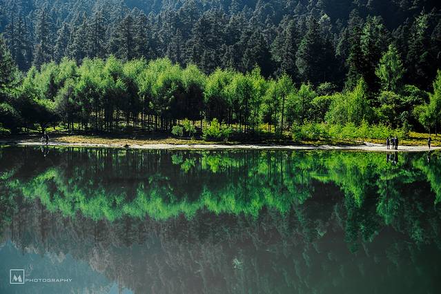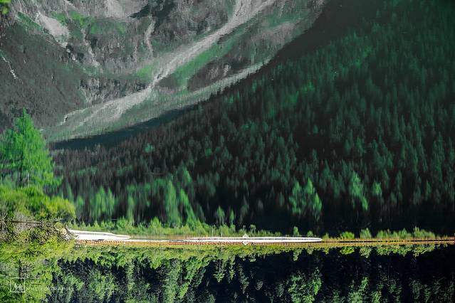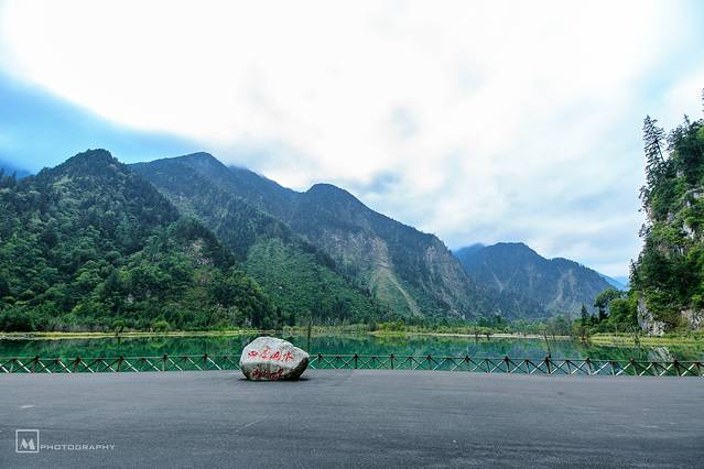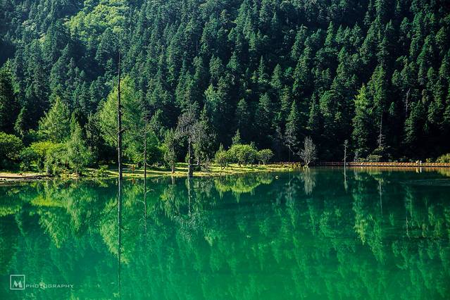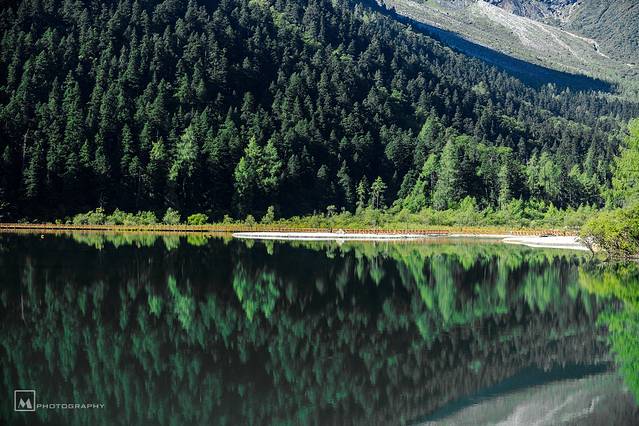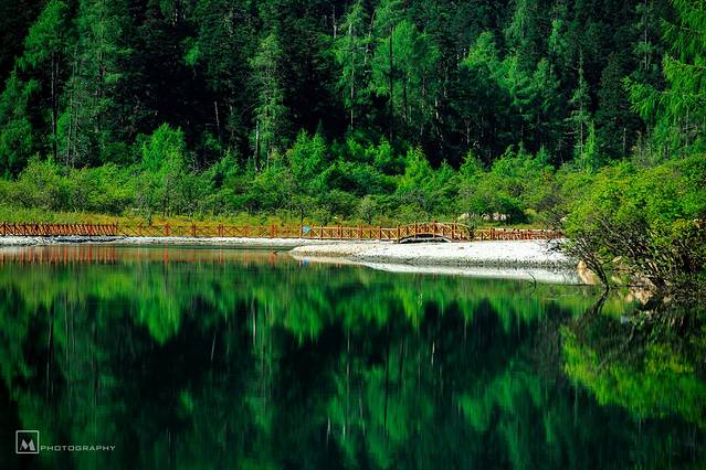 抵达磐羊湖,这里是整个景区的核心景点,来得早果然水面还非常平静,拿出相机,仔细的拍了水中的倒影
