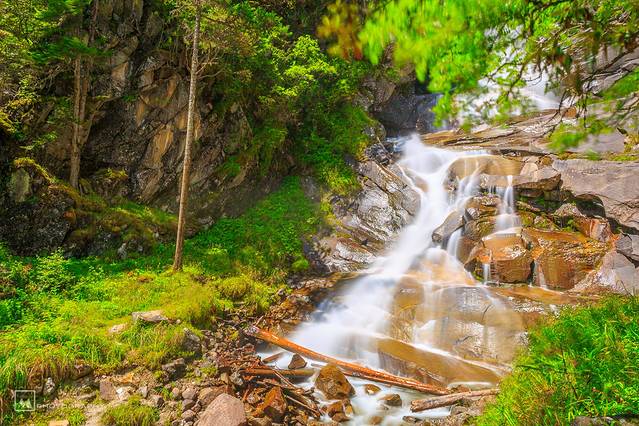 观景台再往下十多米,有分叉路,一座木桥横跨小溪,再穿过电动车道,顺着栈道继续向上大概100米,就到了白龙瀑布面前