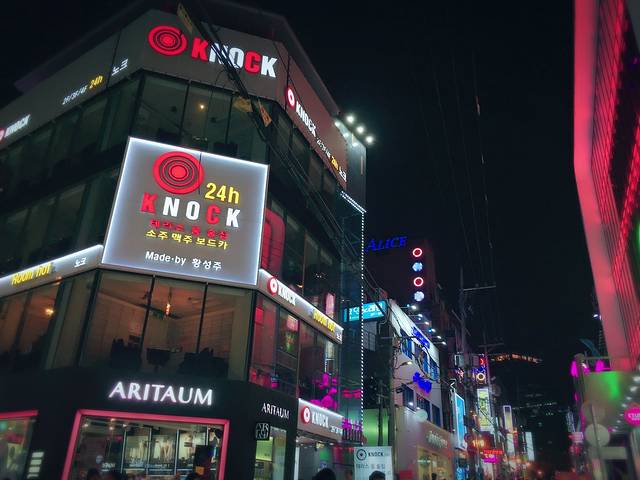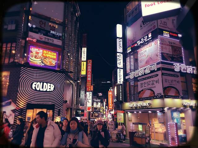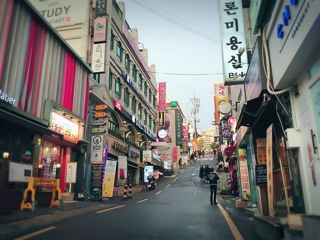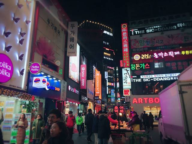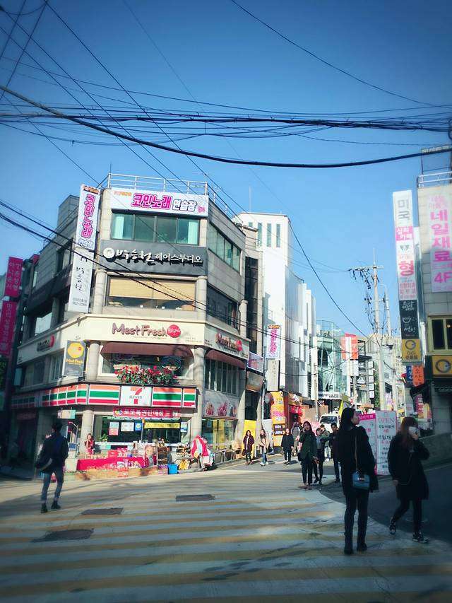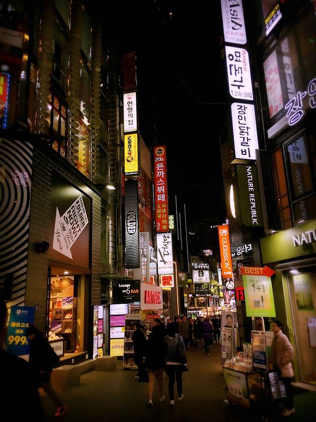 在弘益大学旁边,有数条步行街遍布四周。琳琅满目的名牌店,雅俗共赏的小饰品,以及韩国纸醉金迷的酒吧在这里都可以找到。