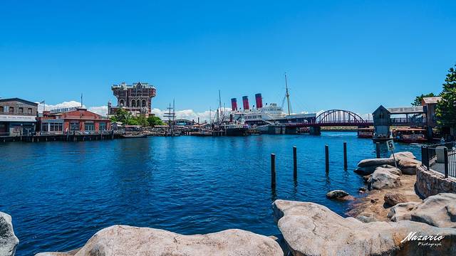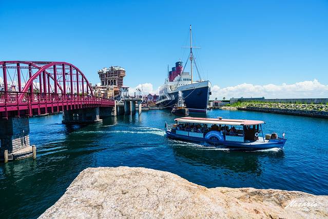 美国海滨的位置和东京湾十分接近,中间虽然有道路、人行道和迪士尼度假区线列车的轨道经过,但在设计上刻意仅让东京湾显露出来,达到借东京湾为背景的效果。