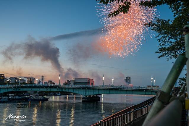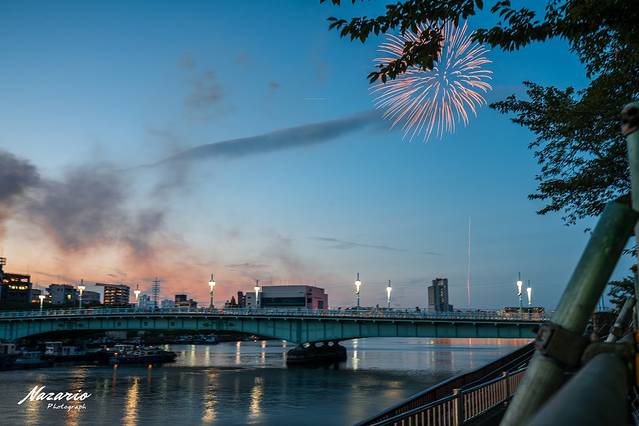 隅田川花火大会是东京具有代表性的烟花大会之一。7月份的最后一个周六,数万发烟花将平民区的夜空装点得五彩缤纷。据说,烟花大会是从江户百姓在纳凉时欣赏烟花的习惯演变而来的,后来发展成为一年一度的节庆活动