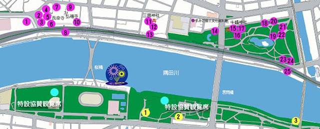 花火大会靠近浅草寺,言問橋上流是第一会场,駒形橋下流是第二会场,傍晚以后的花火大会将会以这个桥为分界线,在两侧分别形成两个分会场!