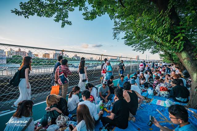 一路走一路看,你会发现只要能看到花火的每一个缝隙都会有当地居民摊好野餐垫,大家席地而坐,感觉非常好,在他们心目中这就是一场全东京人民的大party!