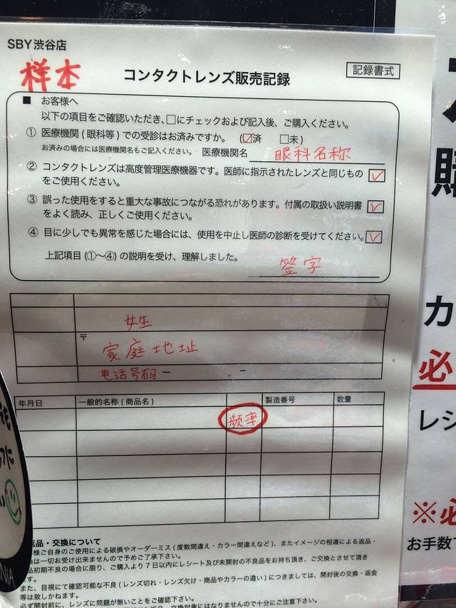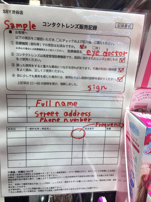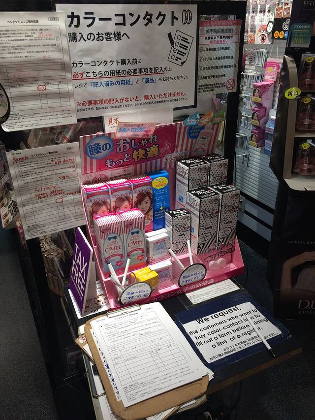 美少女战士的东西不多,也就没有买什么,然后呢看到了有卖隐形眼镜,就一股脑的冲进去买了,这边又要吐槽一下岛国的英语和中文水平了。我看到他们说表格上要写“频率”,英文版写的是“frequency”所以我就很疑惑的写上了everyday,虽然我其实不是每天戴的,我又不能写只有旅游才戴。。。反正我写了everyday以后,人家表示我写错了,其实要写的是“度数”。。。可能日本人以为“度数”是几次啊频率啊的意思了。。。
