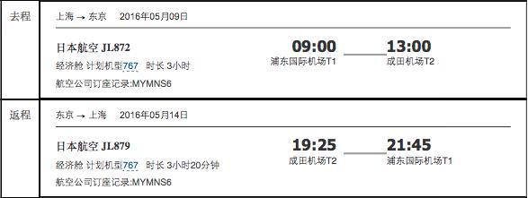 5月9日-5月14日,上海浦东-东京成田机场,日本航空直飞来回一个人1941元,日本和中国有时差一小时。