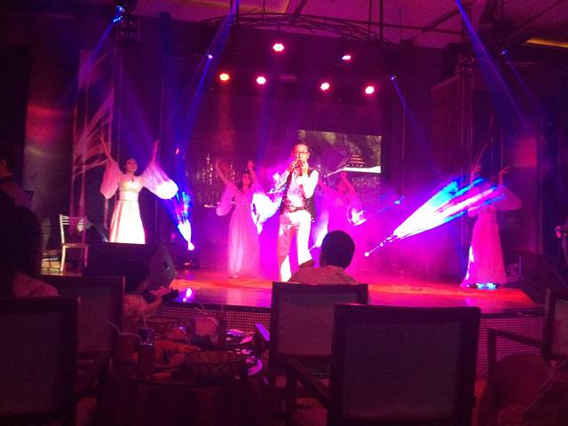 下车过马路走10分钟就可以看到码头了,被告知今天人比较少要晚半个小时开船,于是我们出去打包麦当劳回来吃完就上船了,中途还接了其他的客人,穿上还有琵琶唱歌表演,也推销纪念的扑克牌和CD。当然我们也没有买。两边的灯光景色还是不错的,大概1个小时左右返岸,我们边坐车回到原来的步行街逛逛。