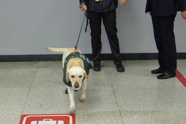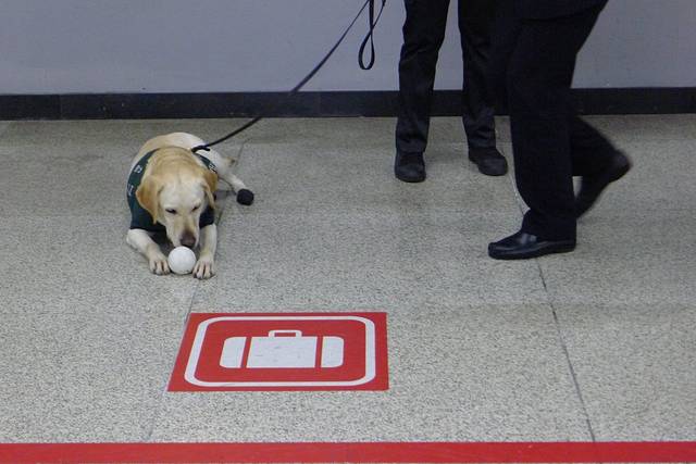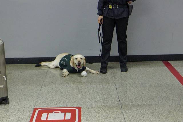 机场的狗狗很可爱啊~还给了她一个球玩,多么