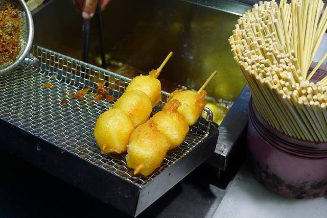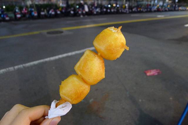 每一次路过的时候这家店一直都是大排场龙,整个老街也就只有这一家有卖这样的东西,其他店都没有,不想金枝肉圆到处都有卖,于是我们就排队买了三个,当时妈妈说每个口味都要来一个,被我拒绝了。后来这几个团子在我们的包里随我们走了好几天,以为都要扔掉了肯定是坏掉了,结果过了几天正好肚子饿挖出来吃,还蛮好吃的,面团团也没有僵硬,反正也没坏,还蛮好的。