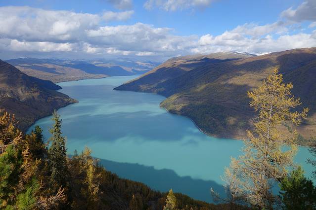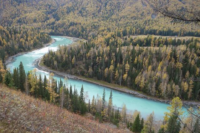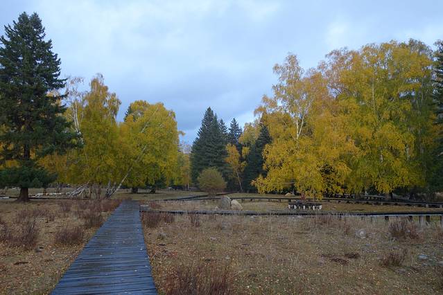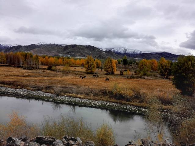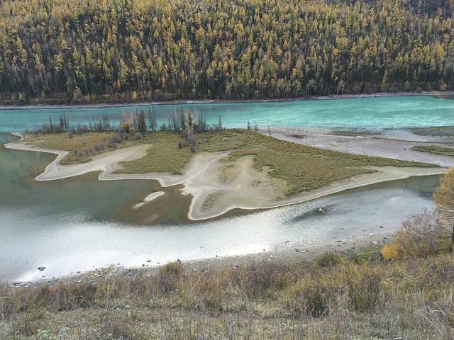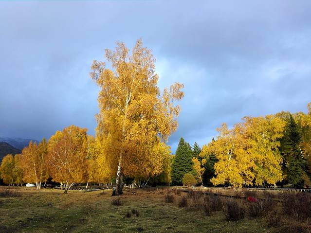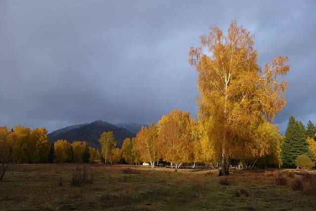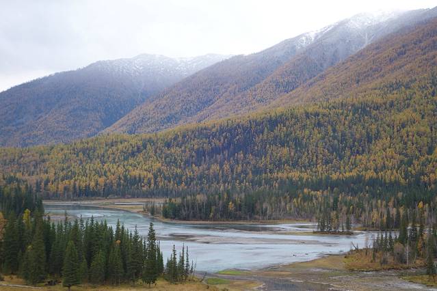 可可托海景区并不是很大,从门口坐区间车到最里面的卡拉卓勒瀑布只需一个小时左右,但由于下过雪后路不好走,车子只开到神钟山,后面那一段路就不走了。我们在神钟山旁边的小河边游玩了一会儿,由于天气始终没有放晴,我们决定不往瀑布那边走了,而是坐回区间车回去离门口较近的白桦林。这片白桦林面积挺大的,而且大部分都已经变黄了,黄色也有深浅不同、加上还没变黄的绿色,色彩还是非常丰富的,只可惜始终阴天,无法体现它的美。