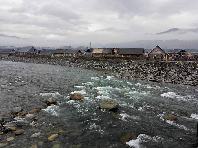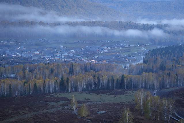 过了大概半个小时,雾越来越浓了,看来今天是无法看日出了;我们决定等到九点半。结果到点了,太阳公公依然是不见影踪,于是我们就下山了。在山脚的白桦林和小河边又拍照玩耍一番,然后回民宿吃午饭、退房,坐区间车离开禾木,向喀纳斯进发。