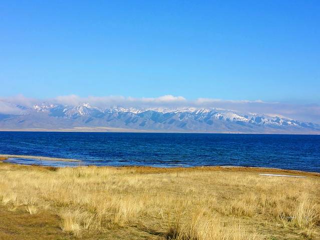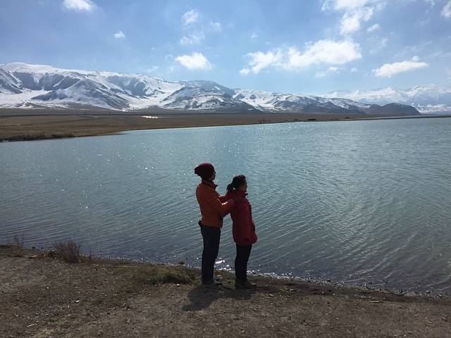 一早起来就抓紧赶路,今天天气不错,天朗气清。由于地处天山山脉地段,一路上雪山似乎一直伴随着我们前行;有好几处还能远眺日照金山,而另外有几处因为中间有云层隔断,感觉山峰好像悬浮在半空,仿佛海市蜃楼一般!中午到达赛里木湖,让我比较惊讶的是,这里出名这么长时间了,景区门口和附近居然没有配套的餐饮、购物等商业配套,只有驻守在此的公安部队的办公楼和食堂,旁边有几栋在建的房子,不知是否作为商业配套。但这也有好处,证明没有过度开发,保育得比较好。问了一名警员说我们也可以到他们食堂吃饭,但我们进去以后,里面的工作人员却说这里不对外的。幸亏车上还有干粮、水果和酸奶,干脆就不浪费时间找吃的了,直接进景区游玩。赛里木湖是新疆海拔最高、面积最大、风光秀丽的高山湖泊,又是大西洋暖湿气流最后眷顾的地方,因此有“大西洋最后一滴眼泪”的说法。湖水清澈透底,透明度达12米,所以有另一个更好听的名字--“天山的明珠”。