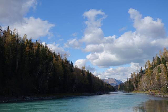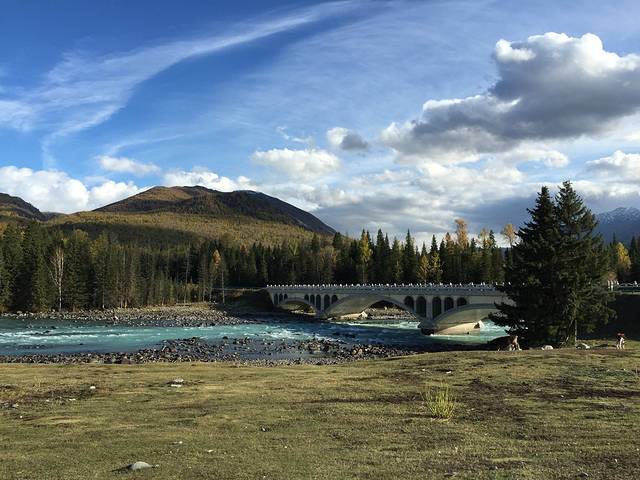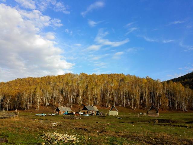 来到距离换乘中心不远处的小河边我们提前下了车,这里景色不错,我们又逗留了一个小时左右就步行回到换乘中心坐区间车回到景区大门,然后开车在贾登峪找了家温州饭店(这家是昨天经过时就问过的,今天她还是按昨天的报价240/标间;其他今天才来的游客价格基本都要400以上)。饭后我们就去附近的超市买一些干粮,因为明天打算整天在喀纳斯景区里面,没有吃饭的地方。买好东西回到住处。只见天空早已满天星斗,繁星闪烁,而且由于今天下午一直天晴,云很少,所以星星的亮度非常高,非常清晰,感觉比7月在龙脊梯田看到的还多。这些都在他们这里司空见惯的景象,在我们那里,都已经变成了奢望。观赏了一会,由于晚上实在是太冷,而且第二天要早起,想着这次还会去赛里木湖观星,所以虽有不舍但还是回房间休息了。