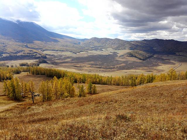 由于准备晚上要住禾木或喀纳斯内,早上就把当晚可能需要的换洗衣服放进背包(其实也就只是内衣裤而已,因为天气较冷衣服都基本已穿上了),大件行李就放在车里停在景区门口了。今天天气不错,阳光明媚。离开布尔津不远处(232省道边)有一条小河,河边一片人高的芦苇林,我们马上在桥头停车围着芦苇拍照;刚好遇到牧民赶着一大群羊经过,瞬间我们的车就淹没在羊群中。羊群离开后我们上车继续赶路,走到半山腰又停下来,一边回头拍山脚的村庄,一边远眺云雾围绕的群山、还有远处云雾之上若隐若现的雪山山峰。自驾很大的好处就是这样自由,看到风景好的地方随时可以停车。我们就这样边走边看边拍,从布尔津到贾登峪大概100公里的路程,还没到景点就已经用了大半天。
