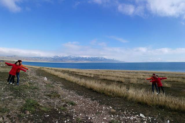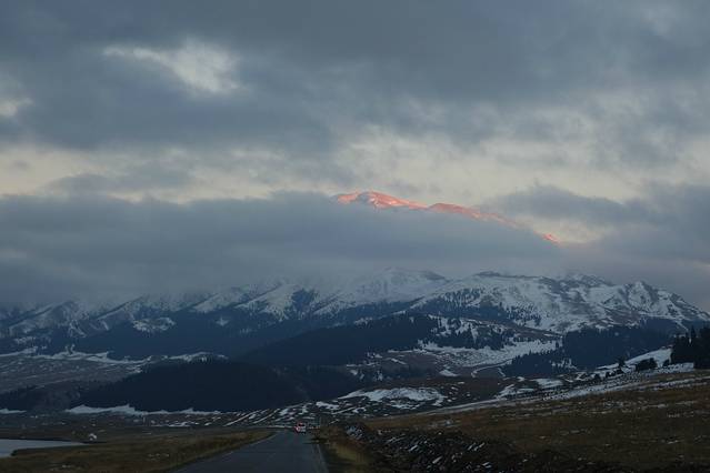这里比较好的是可以开车游览,公路就沿着湖边修建。我们从东门进入,在这里拍照玩耍了约30分钟,然后上车向南门方向驶去。只见路的左边是美丽无边的赛里木湖,路的右边先是一片草地,然后是看似近在咫尺的雪山;穿行在如此美景当中实在是一件乐事!赛里木湖一望无垠,若非湖对面尽头处有绵延的雪山,那感觉就像是海。她静卧在天山山脉的怀抱中,湛蓝、宁静、纯洁。尤其是那一片蓝,蓝得让人心醉!我们选了几处不同景观的地点下车拍照玩耍,在芦苇中、在草丛里、玩雪球、吹蒲公英、摆各种POSE......玩得不亦乐乎、流连忘返;一直玩到太阳下山。只可惜西边云层太厚,没看到日落,但却看到短暂小型的日照金山。