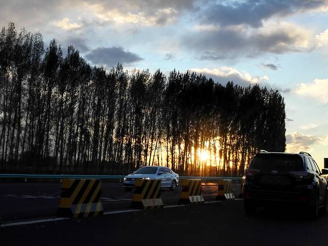 我们在林中逛了大概20分钟,这时候天空突然来了几丝光线,我们简直就像久旱逢甘露般赶紧抓紧拍照。可惜阳光照射的时间实在是太短了,只有短短2、3分钟,可以说是稍纵即逝,只拍了几张照片就又变回阴天了,实在是太可惜了!如果是晴天加上有蓝天白云,这里肯定是美景醉人!可惜天公不作美啊!这算是此行的一个遗憾。天色渐暗,山路崎岖,这个神圣而艰巨的驾驶任务又落在了Wangzhiyuan身上,当然他也继续很好的完成了任务。晚上9点回到富蕴,我们又来到昨天班哥请我们吃羊腿的那家店,由于昨天肉已经吃太多了,今天就简单吃几个小菜就行了;可惜Xiaoyan在与班哥微信聊天时泄漏了行踪,结果班哥直接打了电话给老板娘把我们的单给免了,又享受了一顿免费晚餐!而且已经较晚了,不想再到处找住处了,结果又到班哥的豪宅多住了一个晚上。