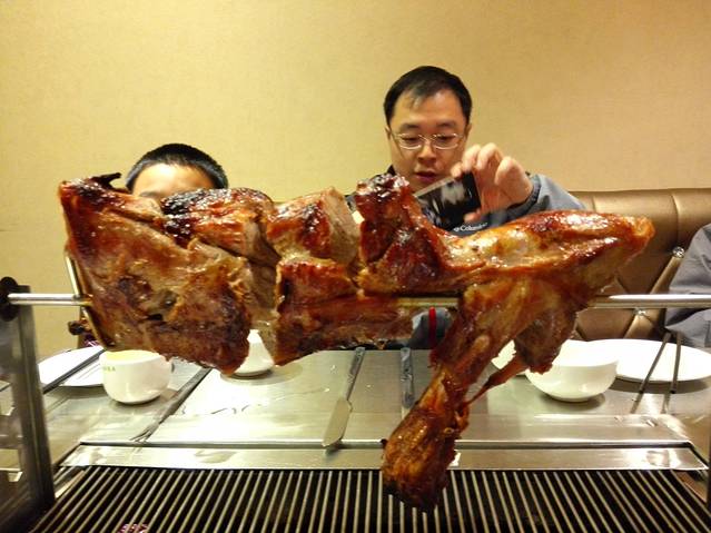安排好豪宅,班哥当然已为我们安排好丰盛的晚餐,就是塞外热情如火的烤羊腿!店家先把整只羊腿烤熟,然后把羊腿架在客人的桌上,架子下面是碳炉,起保温作用。客人自己用刀叉把羊腿肉一片片割下,根据自己口味粘上孜然粉或辣椒粉,店家火候掌握得很好,羊肉嫩滑爽口,大口大口地吃肉,非常的豪迈和满足;而且还有烤羊肉串、烤羊排、烤狗鱼,全部都色、香、味全;再配上当地的夺命红乌苏啤酒,真是人生一乐也!酒足饭饱回住所的路上,班哥继续带给我们惊喜,买了一箱新疆有名的天润酸奶给我们。这酸奶非常好喝,浓浓的奶香中有一丝淡淡的果香,马上成为之后几天我们首选的饮品!住所的装修并没有走豪华的路线,而是清新舒适,恰好给人一种家的感觉;远离故乡,需要的可能恰恰就是这种家的感觉。这晚可能是整个行程睡得最香、最安稳的一晚。