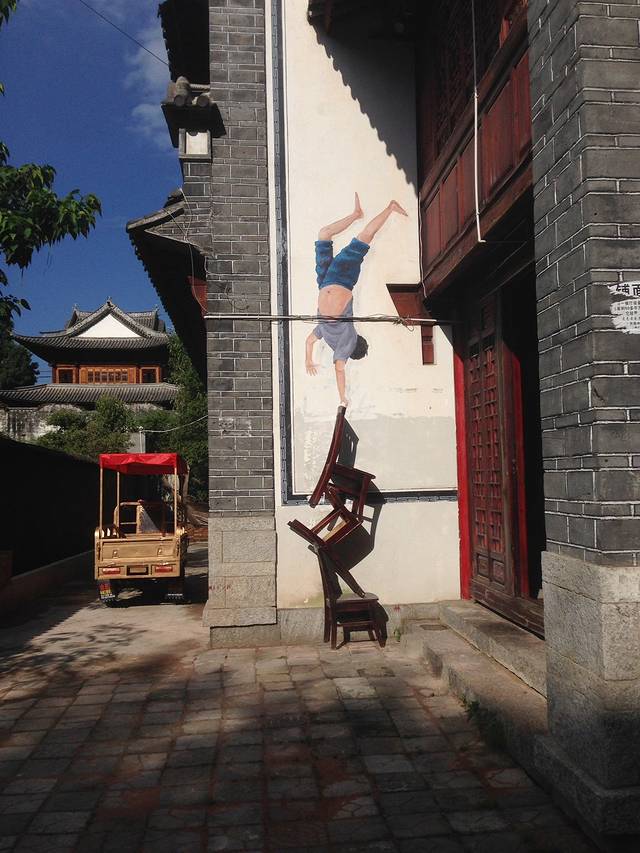 仔细看这里,椅子是真实的,而玩杂技的小孩儿是画上去的,有一种错觉,他们是一体的!