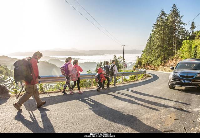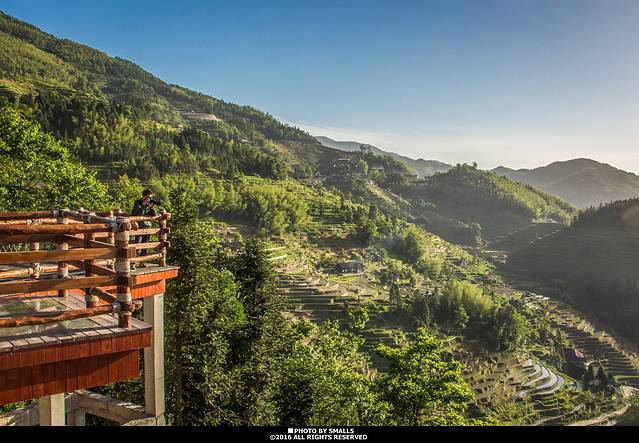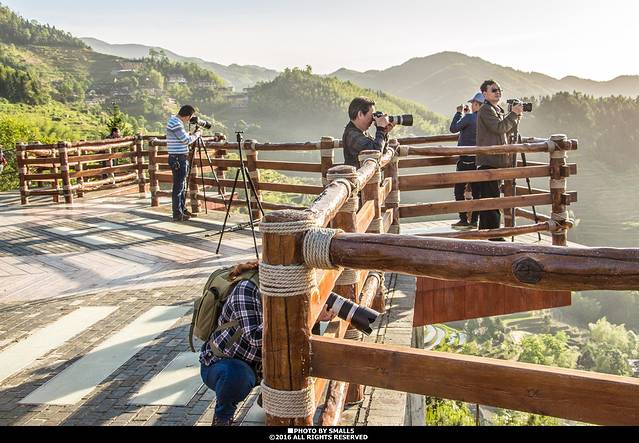 小兵大哥虽然身体微微发福,但是步伐还是非常的矫健的,其实去任何一个景区,一般日出日落跟着摄影爱好者跑就好了,很多不为人知的看美景拍美景的地方。其实从这里的小路往上爬一段,便可到达瑶人冲观景台,很大的观景台,视野非常广阔,但是我们为了拍这块❤形梯田,就准备在这里守候日落了,只是谁知道,我们慢慢的,从晴朗等成了多云。