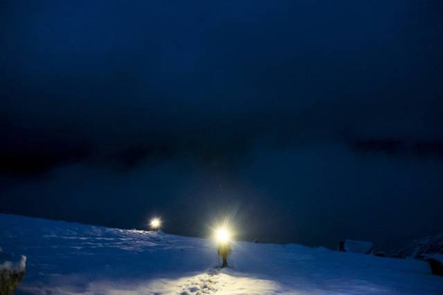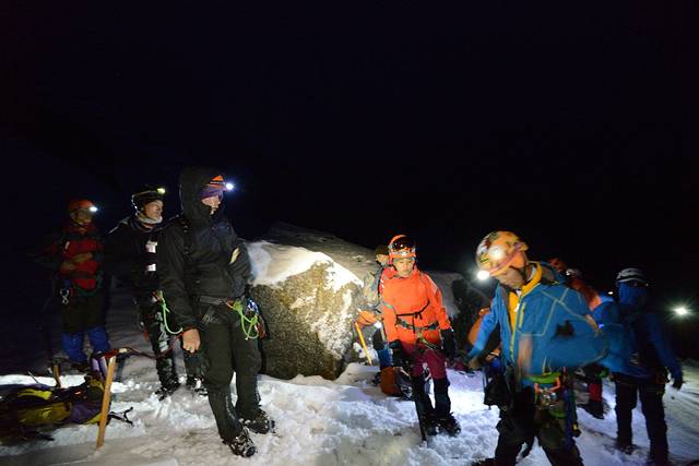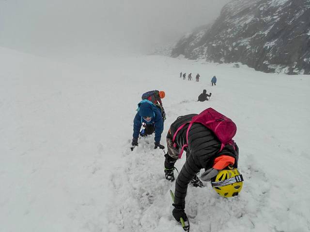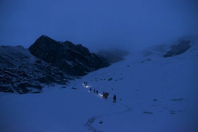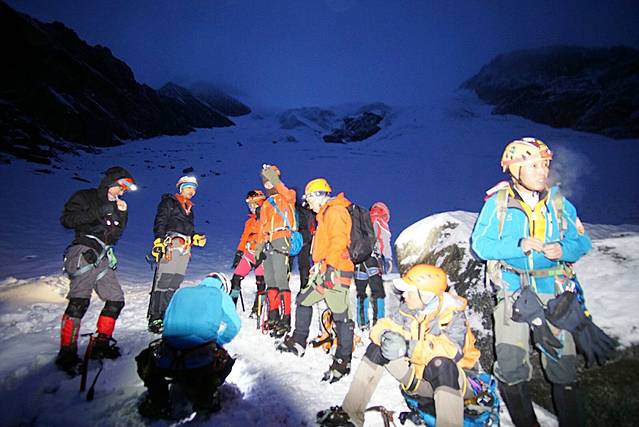 刚开始便是无穷无尽的碎石上坡路,走的很喘,好在大家的速度都保持的挺好的,没有掉队特别远的,都在匀速前进,1个多小时之后来到了雪线之上,换上冰爪继续前进,茫茫黑夜中,几个70度以上的大雪坡横在眼前,雪并不多下面是冰,走起来很滑,必须每一步都要踩稳,隐藏的冰裂缝太多了。