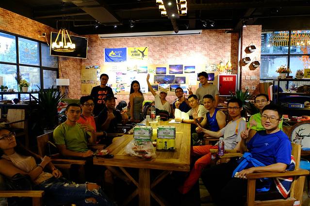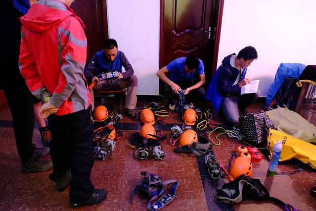 逸飞迟到了,发了个50的大红包作为弥补,整整迟到了1个小时,8点才出发,在车上没忍住打开了老爹的鸭脖和啤酒,很快就解决的干干净净了,协作队由拉罐带领的5人组成,有4人已经提前2天进山为我们的登顶修路铺绳去了,12点到达预定的客栈,开始分配技术装备。