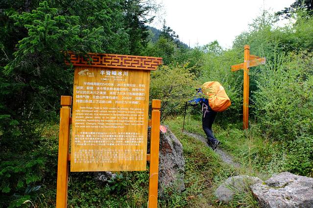 从这儿有一块对半脊峰的描述指示牌右侧进入山区。
